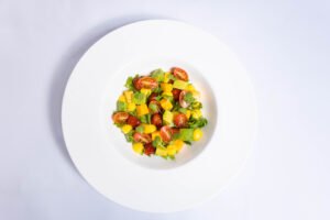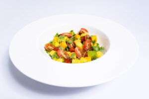 Mango and coconut sauce, lollo rosso, melon, mangoes, cured tomatoes