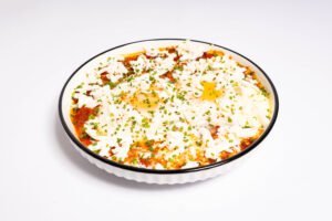 Tomato and bell pepper sauce, poached egg, crumble feta cheese, chives