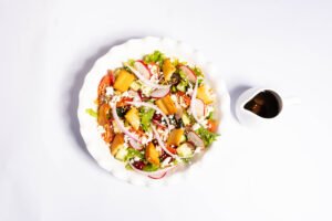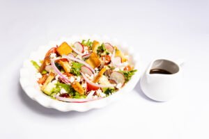 Mixed lettuce, cucumbers, grapes, carrots, feta cheese, sesame seeds, crunchy pita, pomegranate molasses vinaigrette
