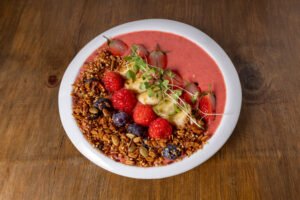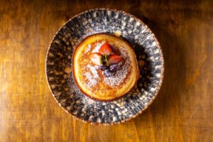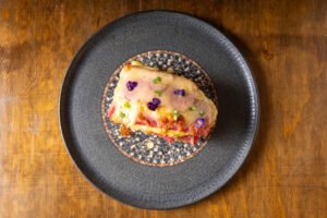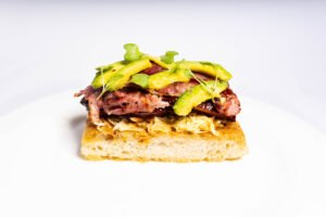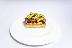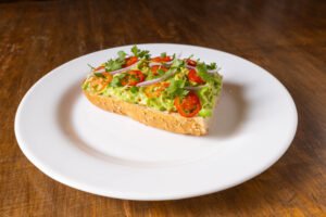 French toast, almond paste, avocado, wilted spinach, confit tomatoes, spiced mushrooms