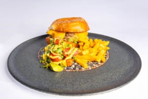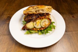 Beef Pattie, cheddar cheese, pickles, sourdough sesame bun