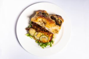 Sourdough focaccia, spicy hummus, grilled chicken, caramelized onions, lettuce, aioli