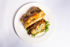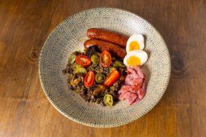 Full Medames, boiled eggs, mushroom, choice of sausage or beef bacon