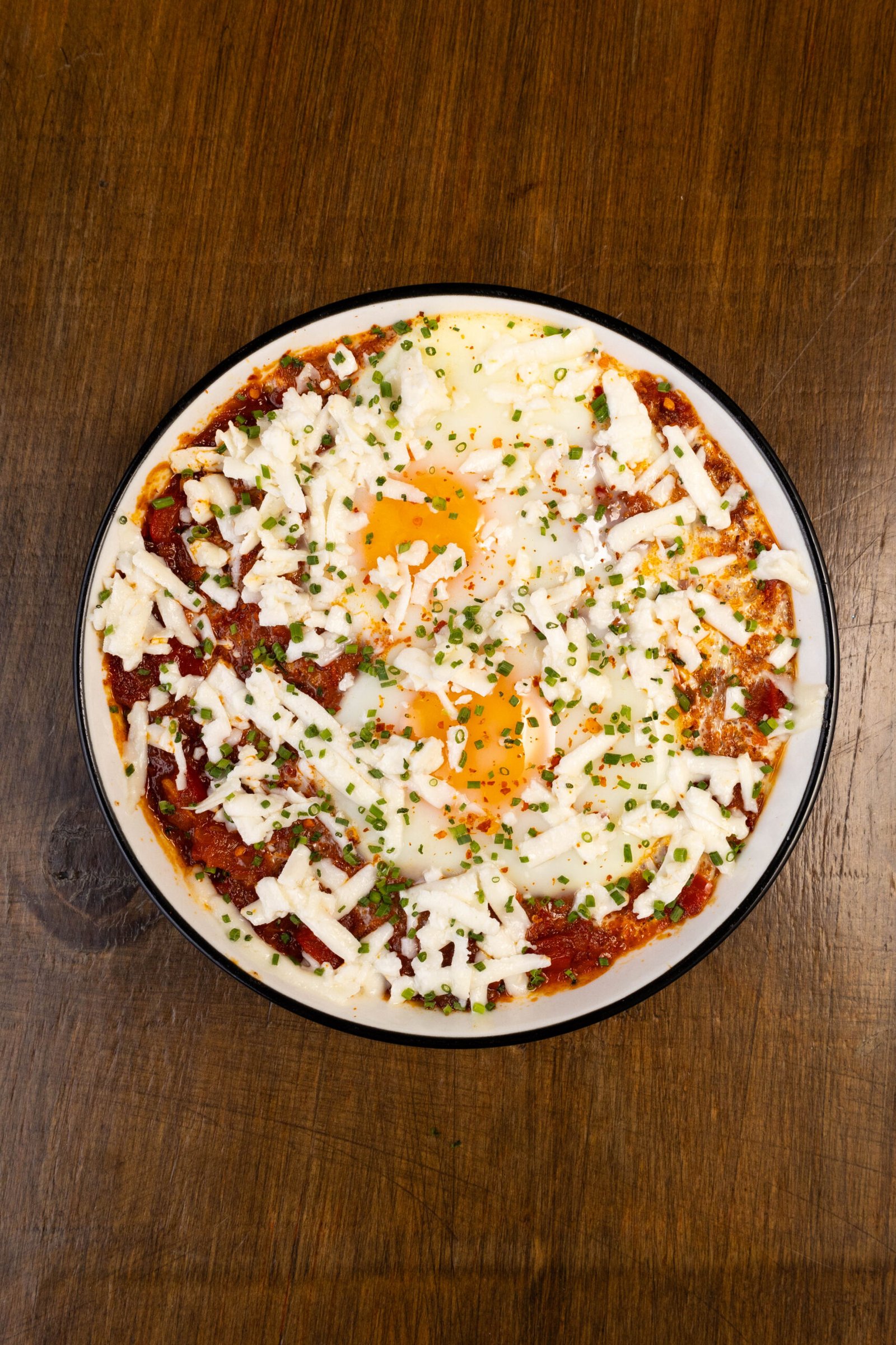 Tomato and bell pepper sauce, poached egg, crumble feta cheese, chives