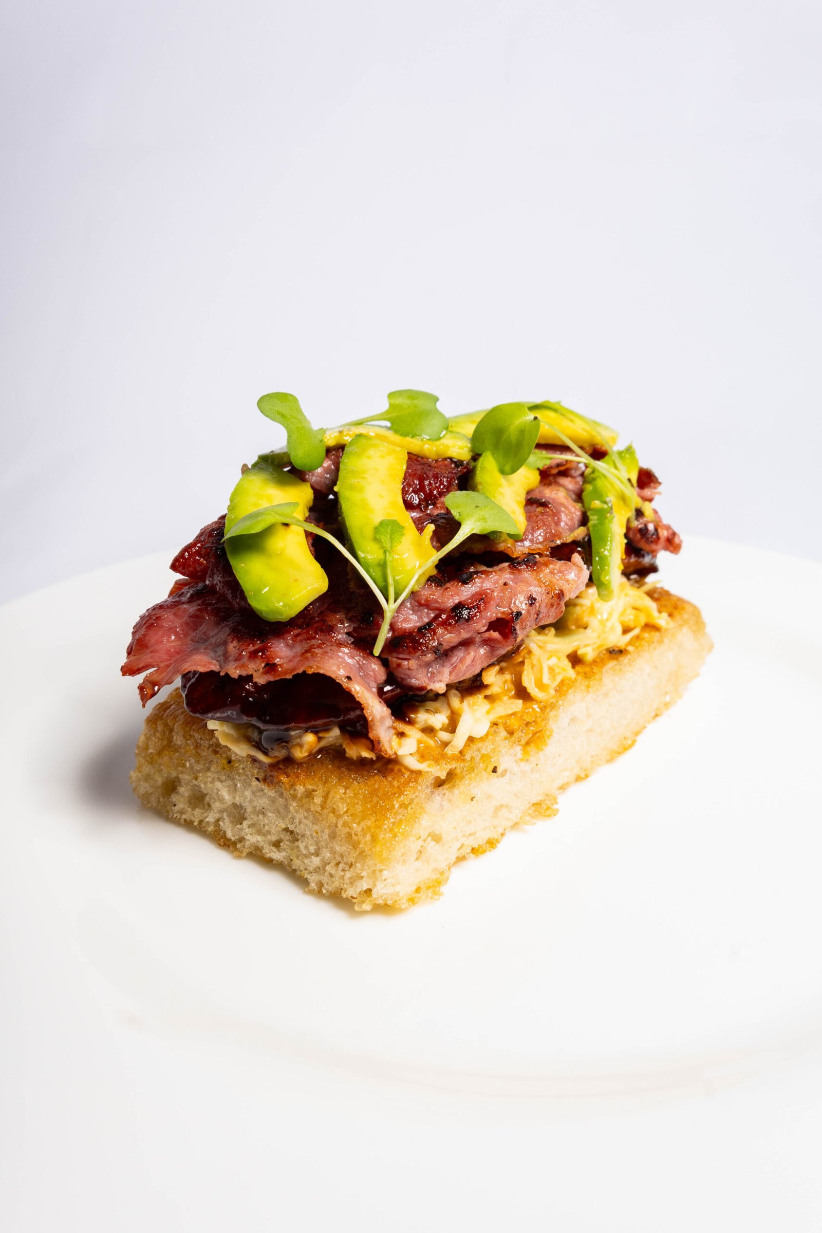 French toast, almond paste, avocado, wilted spinach, confit tomatoes, spiced mushrooms