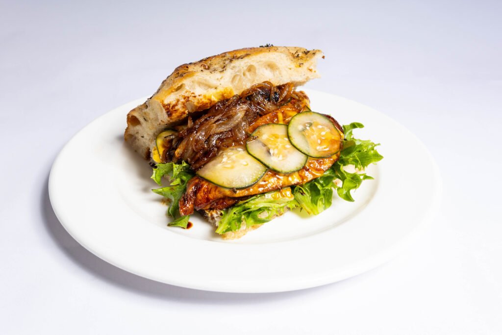 Sourdough focaccia, spicy hummus, grilled chicken, caramelized onions, lettuce, aioli