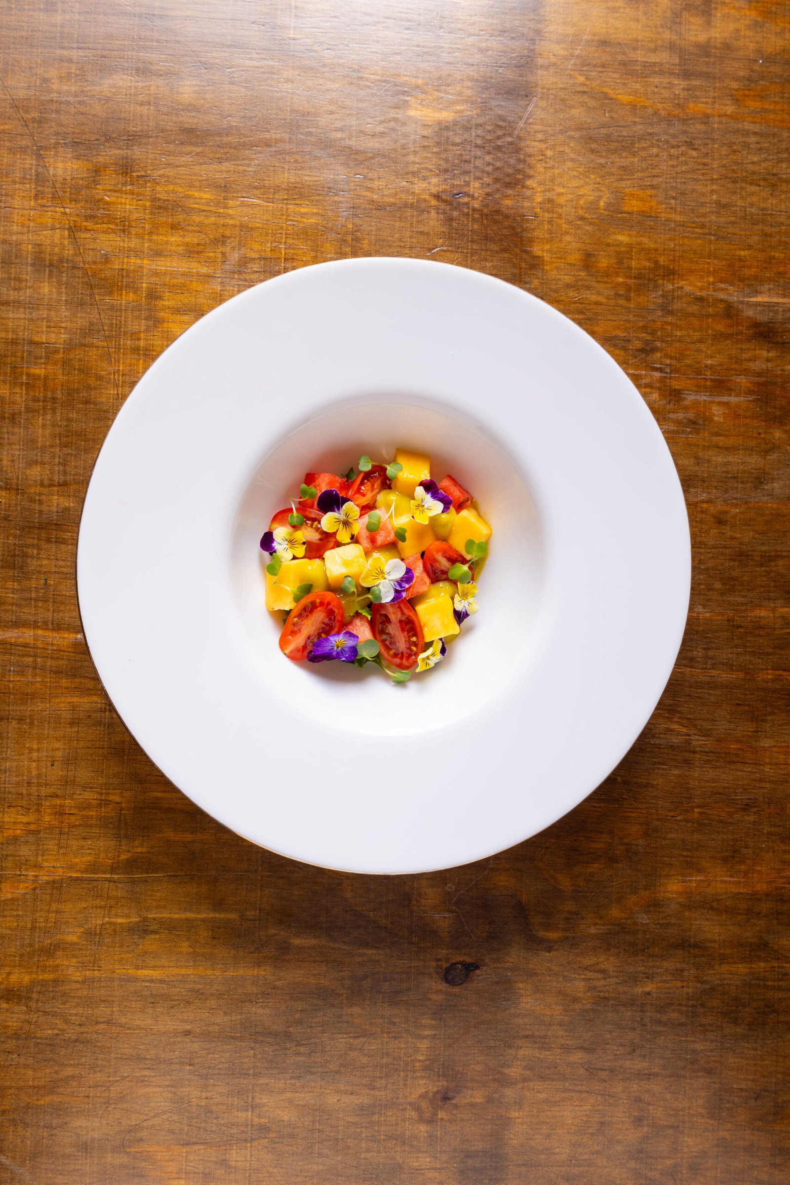 Mango and coconut sauce, lollo rosso, melon, mangoes, cured tomatoes